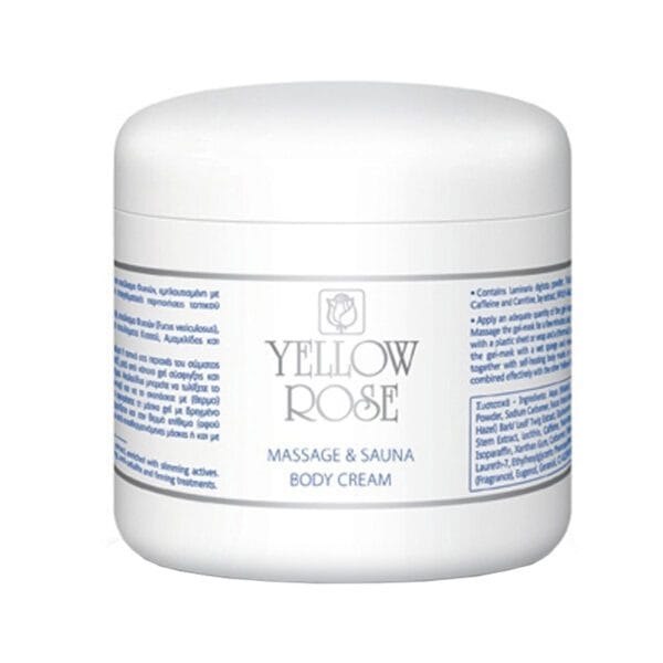 Yellow Rose Body Massage and Sauna Cream – Masāžas krēms ķermenim ar dabīgām augu eļļām, jūraszālēm un bio-aktīvo vielu ekstraktiem. Mitrina un nostiprina ādas elastību. Āda kļūst maiga, gluda un zīdaina. Body Massage and Sauna Cream – Masāžas krēms ķermenim var izmantot notievēšanas un silueta modelēšanas procedūrās, procedūrās ar ietīšanu, kā arī, pirms saunas (darbojās kā toksīnu izvadītājs).