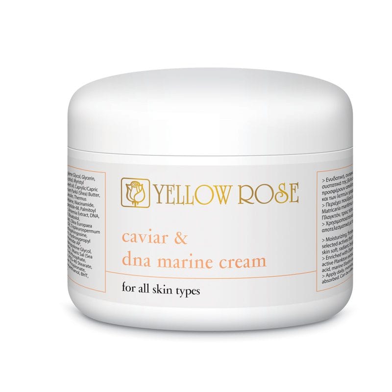 Yellow Rose Caviar & DNA Marine Cream – Sejas krēms ar stores ikriem. Ekskluzīvs pretnovecošanās sejas krēms ar dabīgo stores ikru ekstraktu, nobriedušai un sausai ādai. Krēms nodrošina 24-stundu ādas aizsardzību, izlīdzina grumbiņas, baro un reģenerē ādu, piešķir veselīgu mirdzumu. Krēms ar augstu aminoskābju līmeni, peptīdiem, taukskābēm un oligoelementiem. Caviar & DNA Marine Cream – Sejas krēms ar stores ikriem piemērots visiem ādas tipiem.