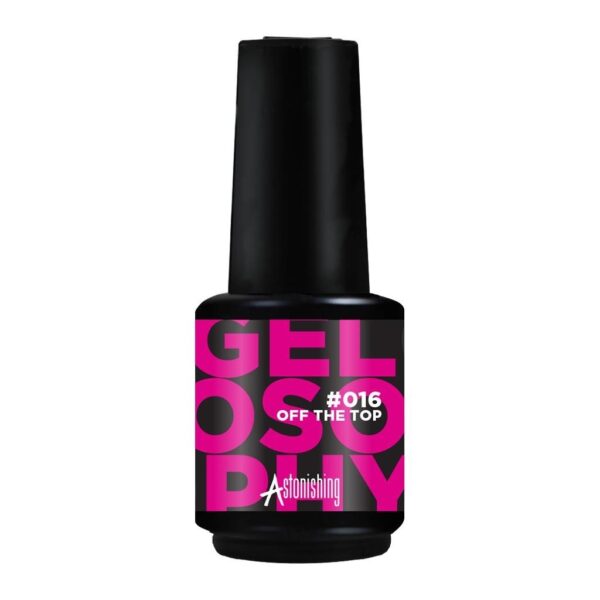 Gelosophy Gel Nail Polish gēla nagu laka #016 Off The Top ir augstas kvalitātes profesionāla laka. Gelosophy ir Astonishing zīmola gēla laku sistēma un viens no populārākajiem zīmola produktiem. Uzņēmums regulāri palielina sistēmas sortimentu. Pigmentētas Gelosophy Gel Nail Polish UV lakas, izlīdzinošas bāzes un dažāda veida virskārtas padara Gelosophy sistēmu par zīmola pārdošanas līderi.