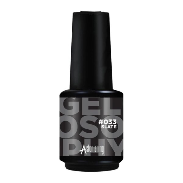 Gelosophy Gel Nail Polish gēla nagu laka #033 Slate ir augstas kvalitātes profesionāla laka. Gelosophy ir Astonishing zīmola gēla laku sistēma un viens no populārākajiem zīmola produktiem. Uzņēmums regulāri palielina sistēmas sortimentu. Pigmentētas Gelosophy Gel Nail Polish UV lakas, izlīdzinošas bāzes un dažāda veida virskārtas padara Gelosophy sistēmu par zīmola pārdošanas līderi.