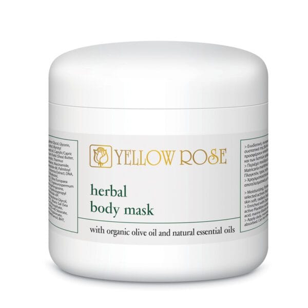 Yellow Rose Herbal Body Mask – Barojoša un mitrinoša ķermeņa maska. Barojoša un mitrinoša maska ķermeņa kopšanai ar 98% dabīgu sastāvu. Pateicoties īpašam sastāvam, tā atjauno un tonizē ādu. Olīvu lapu ekstrakts, kas iegūts no svaigām olīvu lapām izrāda spēcīgu antioksidantu aktivitāti (daudz augstāku nekā C vitamīns un zaļās tējas ekstrakts). Ekoloģiska neapstrādātā augstākā labuma olīveļļa, ko senie grieķi uzskatīja par “šķidro zeltu” – izcila dabiska ādas kopšanas eļļa, kas mitrina, nomierina un mīkstina ādas audus. Sakarā ar augstu ēterisko eļļu saturu, ieteicams izvairīties no lietošanas grūtniecības laikā, sauļojoties un uz ādas, kas ir jutīga pret ēteriskām eļļām.