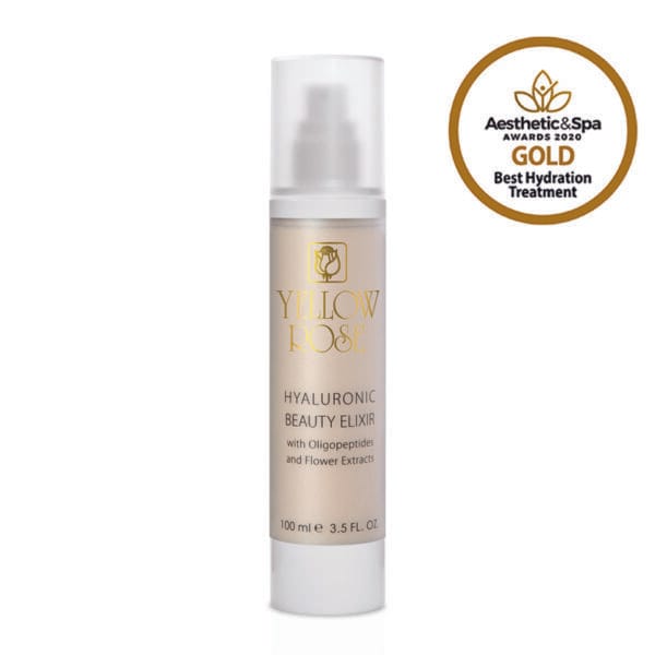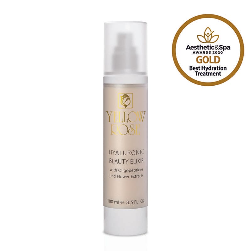 Yellow Rose Hyaluronic Beauty Elixir – Skaistuma eliksīrs ar hialuronskābi. Pieprasītākais un novērtētais produkts ādas dziļai mitrināšanai. Eliksīrs bagātināts ir 3 dažādu hialuronskābes molekulāro masu, tādejādi mitrinot visus ādas slāņus! Mitrinošs, pretgrumbu hyaluronskābes serums-eliksīrs intensīvai ikdienas ādas kopšanai. Augsti koncentrēta hialuronskābes formula ir bagātināta ar pretnovecošanās oligopeptīdiem, grumbiņu filleriem “wrinkle-fillers”, vitamīniem un ziedu ekstraktiem. Mitrina, izlīdzina sīko grumbiņu tīklojumu un mīmikas grumbiņas, efektīvi aizsargā ādu no brīvajiem radikāļiem un uzlabo ādas elastību. Nostiprina, mīkstina, atsvaidzina un izgaismo. Hyaluronic Beauty Elixir – Skaistuma eliksīrs ar hialuronskābi piemērots normālai un sausai ādai. Maiga, zīdaina konsistence. Produkts ieguvis ‘‘Zelta Balvu” kā labākais ādas mitrinātājs Aesthetic & Spa Awards konkursā 2020!