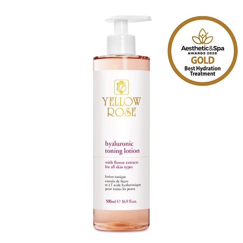 Yellow Rose Hyaluronic Toning Lotion – Tonizējošs hialuronskābes losjons ar mitrinošu un nomierinošu iedarbību. Var efektīvi kombinēt ar citiem Yellow Rose Hyaluronic līnijas produktiem, īpaši ieteicams papildus lietot hialuronskābes pieniņu Yellow Rose Hyaluronic Cleansing Milk un krēmu Hyaluronic Face Cream. Hyaluronic Toning Lotion – Tonizējošs hialuronskābes losjons piemērots visiem ādas tipiem. Hialuronskābes produktu līnija ieguva ZELTA BALVU ”Aesthetic & Spa” Awards 2020. g., nominācijā “Labākā ādas mitrināšana”.