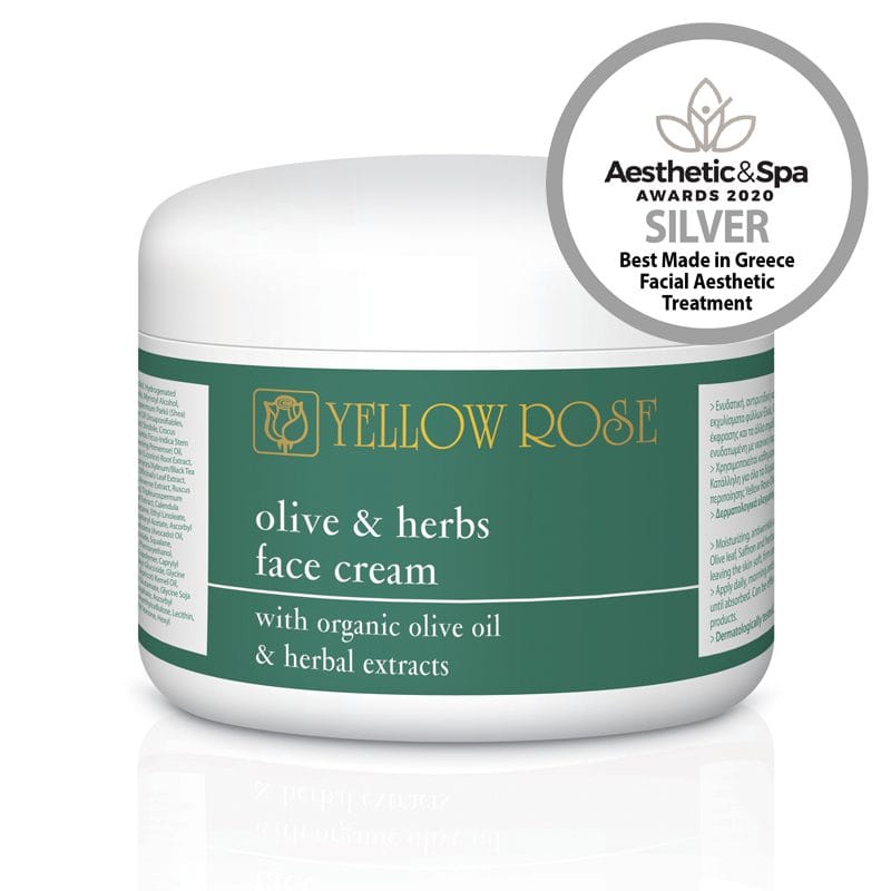 Yellow Rose Olive & Herbs Face Cream – Barojošs olīvu sejas krēms. Mitrinošs, pretgrumbu un barojošs sejas krēms ar organisku neapstrādātu olīveļļu, olīvu lapām, safrānu un augu ekstraktiem. izteikts ”lippo-filling”, dabīgs ”retinol-like”, dabīgs ”botox like”, dabīgs liftinga efekts. Palīdz izlīdzināt sejas grumbiņas, piepildot tās no iekšpuses, palēnina novecošanās pazīmes, padarot ādu maigu, tvirtu un mirdzošu. Piemērots visiem ādas tipiem. Dermatoloģiski testēts. Sudraba balvas ieguvējs Aesthetics & Spa AWARDS 2020 !