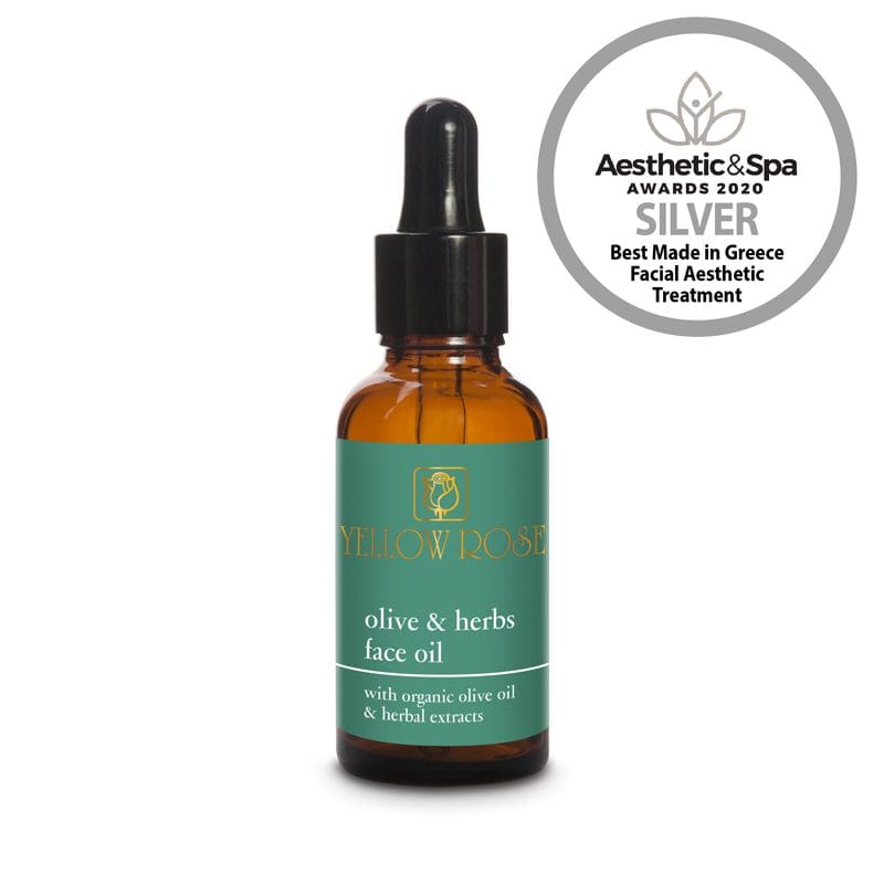 Yellow Rose Olive & Herbs Face Oil – Barojoša olīvu eļļa sejai. Antioksidējoša, ādas pigmentu balinoša sejas eļļa ar organisku neapstrādātu olīveļļu, īpašu C vitamīna formu un bioaktīviem augu ekstraktiem. Mitrina un baro sausu ādu, palīdz cīnīties pret grumbām, nomierina un tonizē, lai piešķirtu tai mirdzumu, tvirtumu un jaunību. Tā viegli uzsūcas, neatstāj taukainības sajūtu. Piemērots visiem ādas tipiem. Dermatoloģiski testēts. Sudraba balvas ieguvējs Aesthetics & Spa AWARDS 2020!