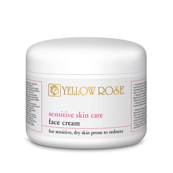 Yellow Rose Sensitive Face Cream – Sejas krēms jūtīgai ādai ar tieksmi uz apsārtumu. Nomierinošs un barojošs, vieglas konsistences krēms ar bagātīgu mitrinošu tekstūru, iedarbīgs visas dienas ga­ru­mā. Bagātināts ar augstu keramīdu koncentrāciju kombinācijā ar prebiotiķiem, nomierinošām, barojošām, at­jau­no­jo­šām aktīvām sastāvdaļām. Efek­tīvi cīnās ar ādas sausumu un nostiprina ādas aizsargbarjeru. Tiek veikta dziļa mit­rināšana ar ilgstošu iedarbību. Nomierina un uz­la­bo epidermu, izveidojot dabisku ādas aizsardzību pret apsārtuma un kairinājuma ierosinātājiem. Tiek sniegta momentāla no­mierinoša iedarbība dedzinošai, svilinošai un durstīgai sa­jūtai.  Acīmredzami samazina apsārtumu, uzlabo, izlīdzina sejas to­ni. Palīdz līdzsvarot ādas mikrobiomu, lai āda kļūst un izskatās veselīgāka. Uzlabo ādas elastību un izlīdzina grumbas un mīmikas grum­biņas. Dziļi mitrina, no­mierina, mīkstina un padara ādu zīdaini gludu. Sensitive Face Cream – Sejas krēms jūtīgai ādai lietojams ikdienā, no rīta un vakarā, uz tīras ādas. Ideāli piemērots sausai, jutīgai ādai ar noslieci uz apsārtumu. Bez smaržvielām. Dermatoloģiski testēts jutīgai ādai.